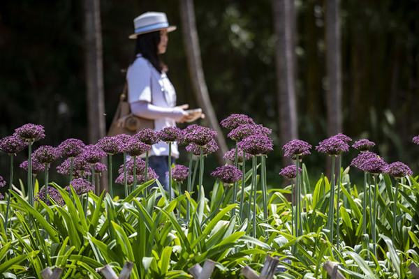 4月3日,一名游客在昆明植物园中乌全球葱园(昆明中心)拍摄葱花。新华社记者 陈欣波 摄