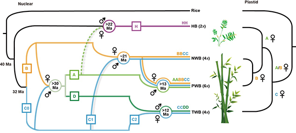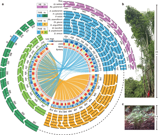 “竹子开花,立马搬家”——我国一些地区传言,竹子开花之后不就后死亡,预示着坏事发生。从科学的角度来看,传言不攻自破。 竹子分为木本竹类和草本竹类,只有木本竹类开花后死亡。木本竹类茎秆高大,木质化程度高、营养生长几十甚至上百年,最长的可达120年,之后才开花死亡。相比之下,草本竹类一般仅几十厘米高,木质化程度低,与其它禾草一样每年开花结实。 木本竹类的独特性状背后蕴含着怎样的科学原理?中国科学院昆明植物研究所研究员李德铢带领的研究团队的一项新研究表明,木本竹类二倍体祖先之间的古杂交事件中存在“亚基因组的优势转移”,导致了木本竹类独特性状的演化。 近日,相关论文在《自然—遗传》上在线发表。这一结论为研究竹类植物物种多样化和独特性状的起源提供了多组学证据。 在植物演化史的研究中,多倍化或称基因组加倍始终是科学家关注的热点之一。木本竹类包括四倍体的温带木本分支、新热带木本分支和六倍体的旧热带木本分支约有1576种,占整个竹亚科种数的92.6%,主要是二倍体的草本分支仅有约126种。