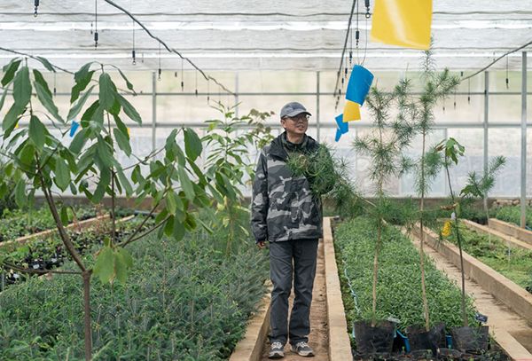 3月27日,许琨在丽江高山植物园一处温室内查看植物生长情况。