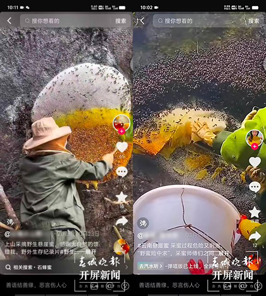 猎取野生蜂蜜让他们暗自伤心 抖音、微信等平台上,时不时会刷到人们割野生蜂蜜的视频,发视频的人还会配上这样的文字: “翻山越岭攀岩走壁,功夫不负有心人,终于找到野生蜂蜜 #大自然的馈赠 #野生蜂蜜采摘 #农村。” “走路4个多小时才到采摘野生悬崖蜜现场…… #悬崖取蜜 #纯天然野生蜂蜜 #大自然的馈赠”