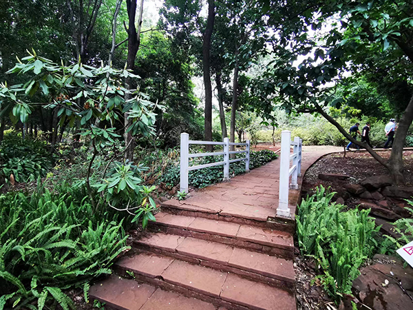 园内小径 云南是一块美丽富饶的宝地,山奇水异,地形独特,高山大江纵横,背靠青藏高原,面向中南半岛。其境内有海潮如海的热带雨林,五彩缤纷的高山草甸,终年不化的皑皑白雪,峻峭幽深的高山峡谷,热带、亚热带、温带和高山寒带等多种气候齐全。复杂多变的地形和气候孕育了丰富多采的植物种类。土地面积仅占全国面积4%的云南,高等植物多达15000多种,占全国总种数的一半,因而获得了“植物王国”的美誉。因此昆明植物园享有得天独厚的生态环境与自然条件。 该园始建于 1938 年,地处“植物王国”云南省首府昆明市北郊黑龙潭风景区,海拔 1914-1990 米。属中亚热带内陆高原气候,年平均气温 14.7℃,年平均降雨量 1006.5 毫米,年平均相对湿度 73%。已建成了山茶园、岩石园、竹园、水生植物园、中乌全球葱园(昆明中心)、羽西杜鹃园、观叶观果园、百草园、蔷薇园、木兰园、金缕梅园、极小种群野生植物专类园、壳斗园、扶荔宫温室群(包括隐花植物馆、主体温室、兰花馆、食虫植物馆等)、裸子植物园等 16 个专类园,收集保育来自全球、特别是我国西南地区的重要植物资源 8840 余种及品种。目前已成为集科研、科普、旅游、教学实习为一体,具有云南特色的多功能综合性植物园。