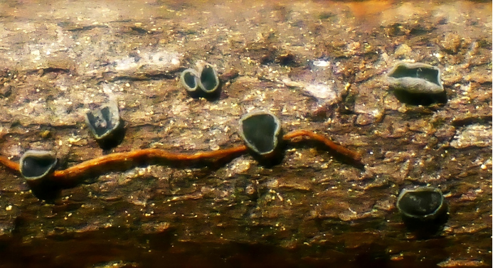 版纳绿杯菌 老君绿杯菌的模式标本发现于云南丽江老君山林中腐木上。它的子实体具有浅蓝色子实层,深蓝色子层托,表面具有宏观模糊不清的绒毛菌丝,中部和基部分叉的侧丝,以及相对较大的梭形子囊孢子。