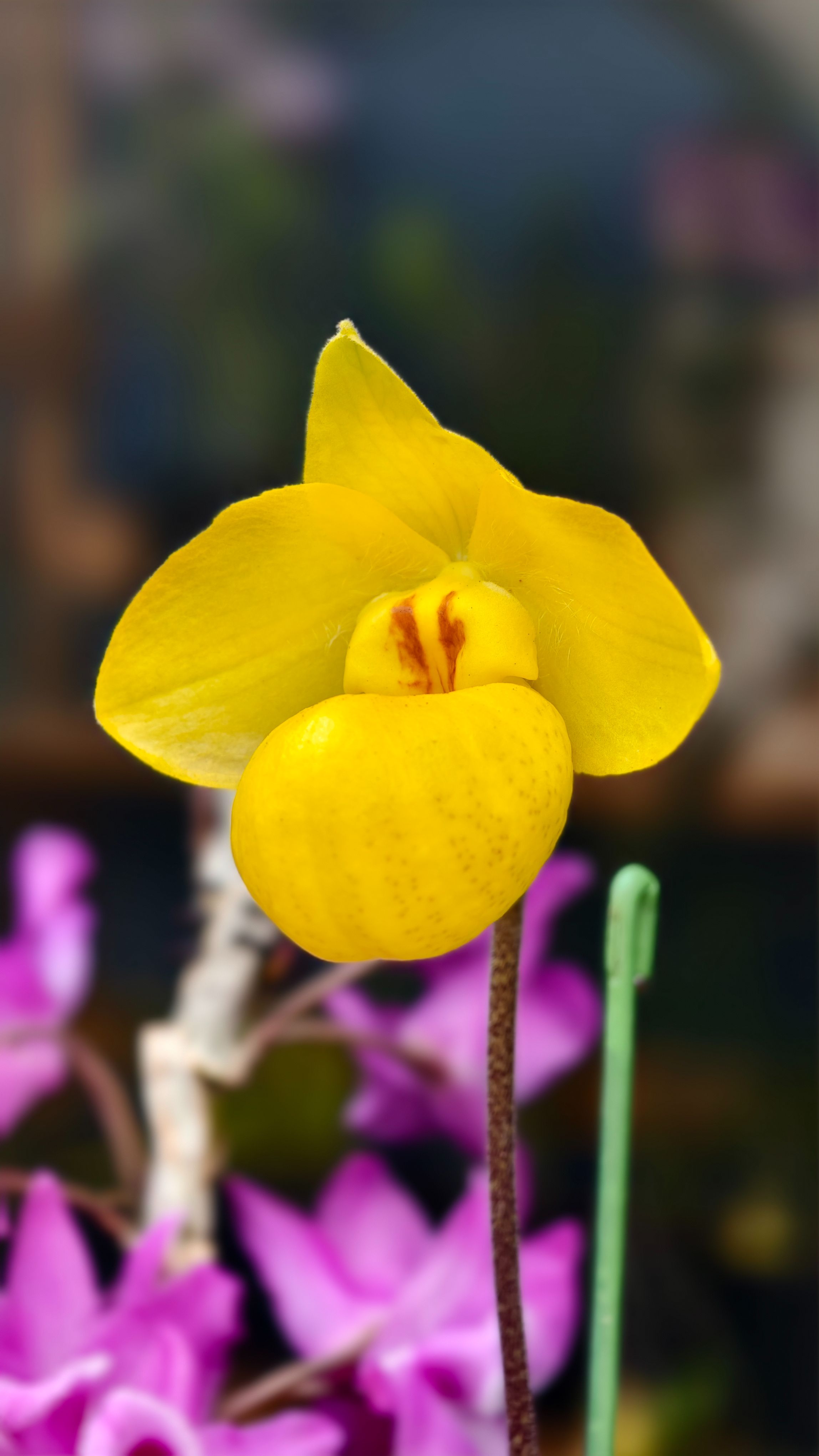 “我们可以通过这个装置,理解兰花的生存智慧。”中国科学院昆明植物研究所工程师李函润介绍,世界上三分之一的兰花在传粉时采用了“欺骗”的方式。以兜兰属为例,杏黄兜兰等通过鲜艳的颜色和花香吸引传粉者访花,兜兰的唇瓣进化出斑点,引诱传粉者进入兜兰的“兜”,经过通道时会把花粉带走。