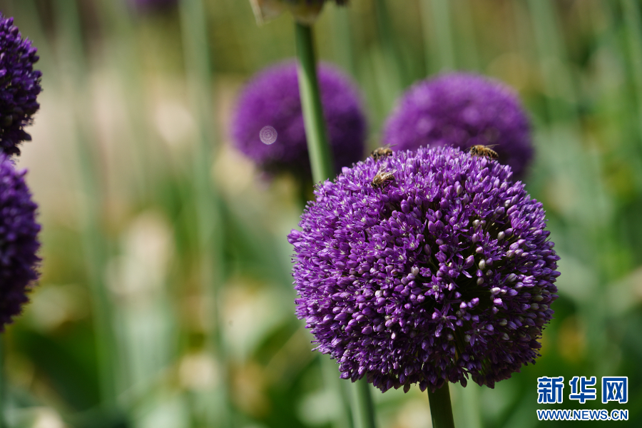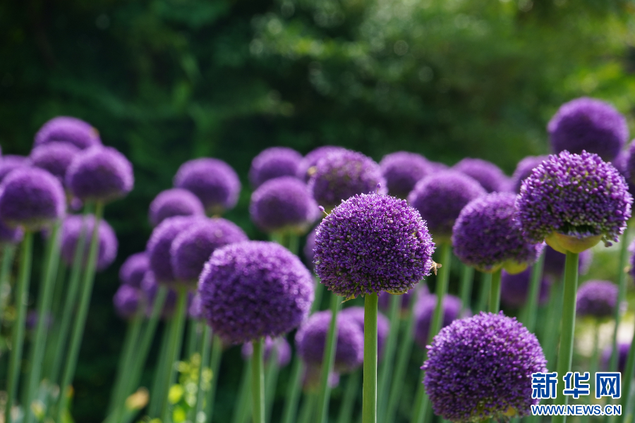 开放着紫色花朵的葱属植物(4月27日摄)。新华网发(曹霞 摄) 细长直立的花茎顶端,层叠次第开放的球形花序如繁星点点,吸引着蜂蝶沉醉期间,这些花序由密集细碎的小花簇拥而成,深深浅浅的紫,组成了浪漫的紫色风景线。