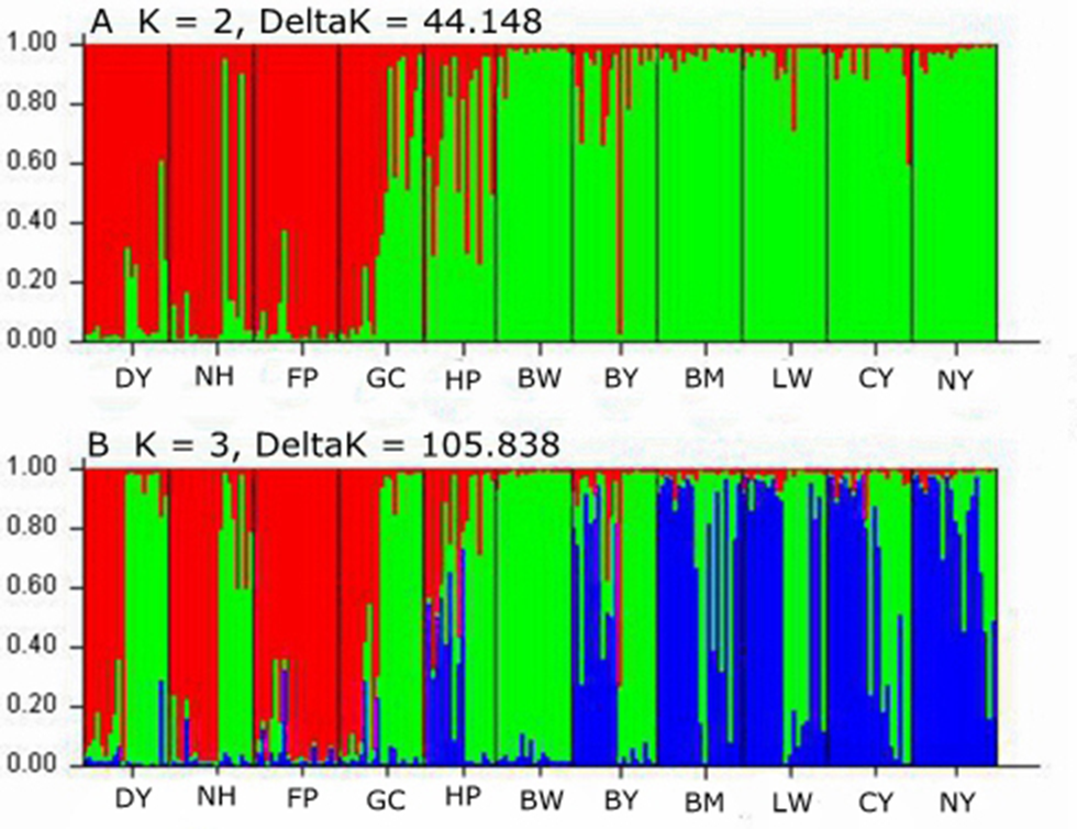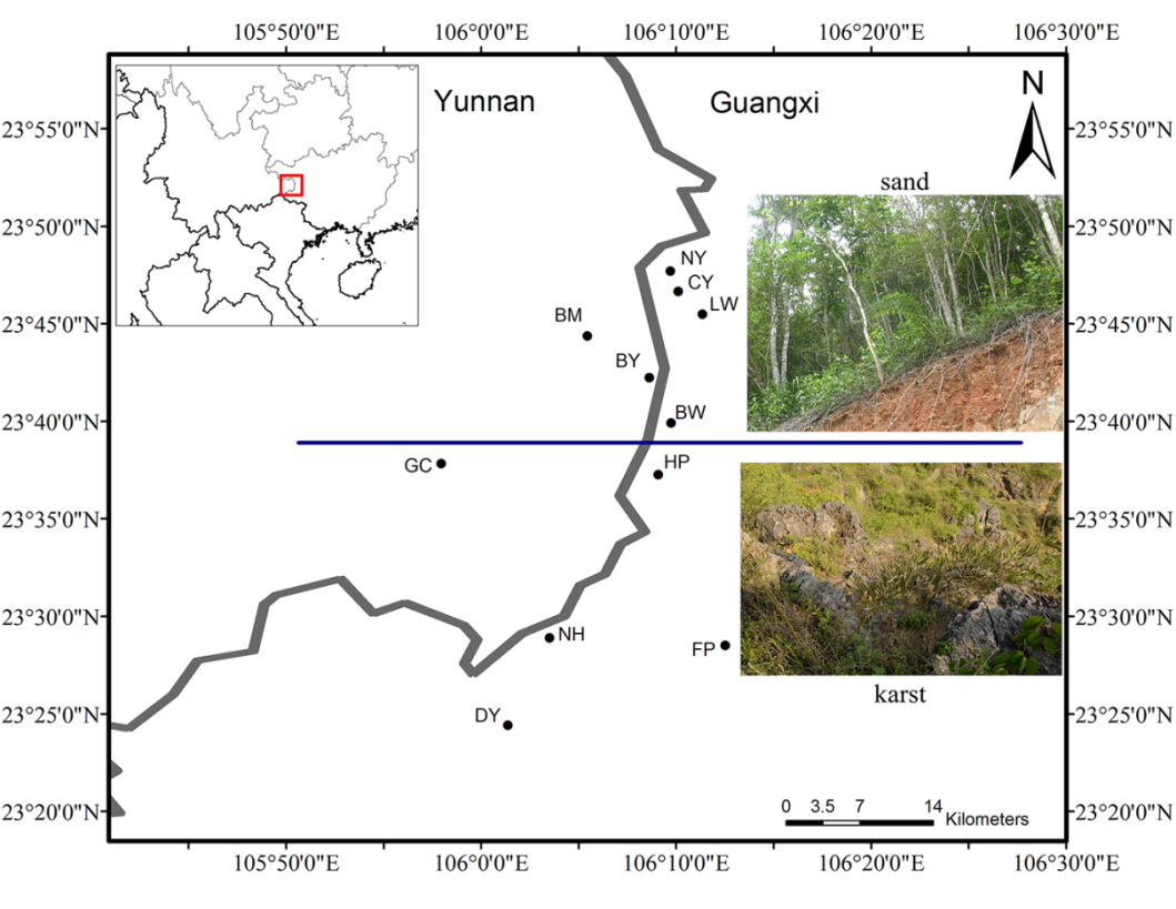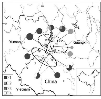 德保苏铁(Cycas debaoensis)为中国特有种,为2-3回分叉的羽叶复叶,具有重要的观赏和研究价值,为国家一级重点保护植物。目前,德保苏铁仅分布于广西百色和云南文山地区,生长于石灰岩山地和由砂页岩发育而来的土山中。 中国科学院昆明植物研究所龚洵研究组长期以来关注中国苏铁属植物的谱系地理和保护遗传学研究。在德保苏铁的研究上,龚奕青博士采用两个叶绿体片段(psbA-trnH,atpB-rbcL)研究德保苏铁的遗传多样性和遗传分化。结果表明其遗传多样性低,而遗传分化高(FST = 0.73),分布于石山生境和土山生境的居群之间有了显著的遗传分化,两种生境中的居群有其特有单倍型(图1)。 在此基础上,龚奕青博士通过增加居群和序列数据,采用7个低拷贝的核基因片段和17个微卫星位点研究了德保苏铁的遗传多样性和遗传结构,试图与叶绿体片段的研究结果进行比较。研究发现,德保苏铁核基因的遗传多样性较高,居群遗传分化相对较小(微卫星和各低拷贝核基因片段的FST均小于0.15)。由于德保苏铁叶绿体基因组是母系遗传,只能通过种子传给下一代,而核基因是双亲遗传,遗传物质可通过种子和花粉传给下一代。其叶绿体数据显示居群间遗传分化大,核基因数据显示居群间遗传分化小,揭示了德保苏铁种子流很小,而花粉流远比种子流大,该研究结果为德保苏铁居群的合理有效保护提供了参考和依据。 该研究得到NSFC-云南联合基金(U1136602)的资助,文章以“Pollen-mediated gene flow promotes low nuclear genetic differentiation among populations of Cycas debaoensis (Cycadaceae)”为题发表在Tree Genetics & Genomes上( http://link.springer.com/article/10.1007%2Fs11295-016-1051-6)。