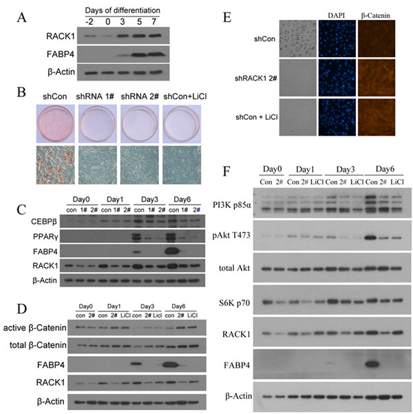 图:RACK1通过Wnt/β-catenin和PI3K-Akt-mTOR-S6K信号通路调节脂肪分化 |