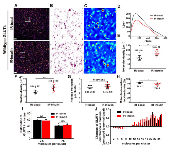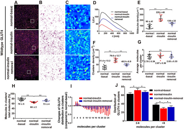 熊文勇研究组在胰岛素抵抗调控GLUT4分布模式的研究中取得重要进展 文章来源:植物化学与西部植物资源持续利用国家重点实验室 | 发布时间:2016-11-29 | 作者:高蓝 | 浏览次数: | 【打印】 【关闭】 葡萄糖转运体(GLUT4)是脂肪细胞和肌细胞中最主要的葡萄糖转运蛋白,胰岛素调控的GLUT4膜转运对于机体血糖平衡的维持至关重要。GLUT4转运障碍是机体产生胰岛素抵抗或患有2型糖尿病的主要表现之一。目前,绝大多数有关GLUT4的研究主要针对GLUT4的表达和膜转运,关于GLUT4自身蛋白活性的研究也有少量报道。然而对于GLUT4在其行使葡萄糖转运功能的地方——细胞膜上的分布模式及其相关影响因素的研究却极少。另外,由于衍射极限的存在使得传统光学显微镜的成像分辨率无法突破200 nm, 这也使得研究者们无法在超高分辨率甚至单分子水平去获取GLUT4在细胞膜上的分布模式的详细信息。 随着超分辨成像技术的出现及迅速发展,使得成像分辨率最高可达到20nm以下,这为科研人员提供了绝佳的工具和手段,从而能在单分子水平去研究细胞膜上GLUT4的分布模式。 中国科学院昆明植物研究所熊文勇研究组与长春应用化学研究所电分析国家重点实验室王宏达研究组合作,利用直接随机光学重建超分辨显微镜(dSTORM),对不同生理状态下脂肪细胞质膜上GLUT4的分布模式进行观察和统计分析,从单分子水平解析了脂肪细胞质膜表面GLUT4在不同生理状态下的分布模式变化。结果显示在胰岛素刺激后,细胞质膜上的GLUT4除了在数量上明显增加外,蛋白成簇能力和参与成簇的蛋白比例的明显下降,趋向于形成小簇或更加随机、弥散的分布模式;当细胞产生胰岛素抵抗后,细胞对胰岛素的敏感性降低,然而相对于正常细胞,胰岛素抵抗让细胞质膜表面的GLUT4呈现出更趋向于成簇或形成较大的簇的分布模式状态。此外,通过突变GLUT4蛋白N端F5QQI序列,破坏脂筏以及微丝等手段初步探究了细胞质膜上GLUT4分布模式的影响因素,发现F5QQI序列和脂筏都与质膜上GLUT4的分布模式密切相关。这是首次发现胰岛素抵抗会导致细胞膜上的GLUT4的分布模式变得更加聚集,这个发现使人们从一个全新的角度对胰岛素抵抗有了更深刻的认识,也为进一步研究肥胖或糖尿病发病机制提供了新的理论基础。