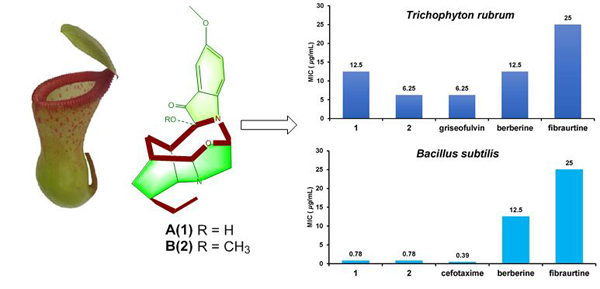 传统药材中吲哚生物碱新颖结构及抗微生物活性研究取得系列新进展 文章来源:植物化学与西部植物资源持续利用国家重点实验室 | 发布时间:2018-06-22 | 作者:魏鑫 | 浏览次数: | 【打印】 【关闭】 单萜吲哚生物碱以其复杂的结构特征以及显著的生理活性,长期以来备受有机化学家和药学家的关注。由于抗生素的滥用,导致严重的副作用及多重耐药威胁着人类健康,而源于植物的抗菌、抗真菌天然小分子备受关注。近期,中国科学院昆明植物研究所罗晓东研究团队与合作者在抗菌、抗真菌单萜吲哚生物碱新颖结构和初步活性研究上取得系列新进展。 1. 中国狗牙花(Ervatamia chinensis)民间主要用于治疗咽喉肿痛及疖肿等疾病,研究组博士研究生于浩飞等从该药材中发现猪笼草状吲哚生物碱erchinines A和B,其独特的结构中具有二氮?并噁唑烷及3个半缩醛胺的复杂单元片段。Erchinines A和B对枯草杆菌最低抑菌浓度(MIC)为0.78 μg/mL,与抗生素头孢噻肟(0.39 μg/mL)几近相比。同时,erchinine B对红色毛癣菌MIC为6.25 μg/mL,与抗真菌药灰黄霉素相当。上述研究成果以“Nepenthes Like Indole Alkaloids with Antimicrobial Activity from Ervatamia chinensis”为题在线发表在Organic Letters (DOI: 10.1021/acs.orglett.8b01675)上。