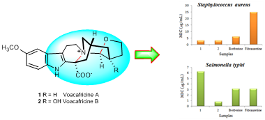 2. 非洲马铃果(Voacanga africana)主要用于治疗疟疾、痢疾和溃疡等疾病,博士研究生丁彩凤等从该药材中获得吲哚生物碱Voacafricines A和 B,其结构单元含吡咯/吡啶/吡咯/哌啶/呋喃稠合的多重杂环体系。Voacafricines A和 B对金黄色葡萄球菌和伤寒沙门氏杆菌抗菌活性优于植物抗菌药黄连素和黄藤素。上述研究成果以“Antibacterial Indole Alkaloids with Complex Heterocycles from Voacanga africana”为题发表在Organic Letters(2018, 20, 2702)。