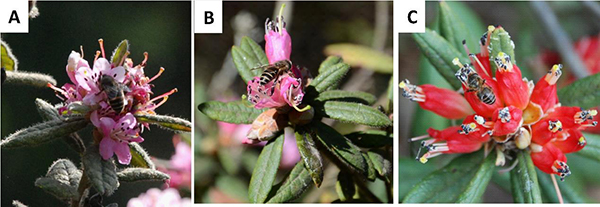 图1. 碎米花(A)、杂种粉红爆杖花(B)、爆杖花(C)的花形态及其共享传粉昆虫中华蜜蜂