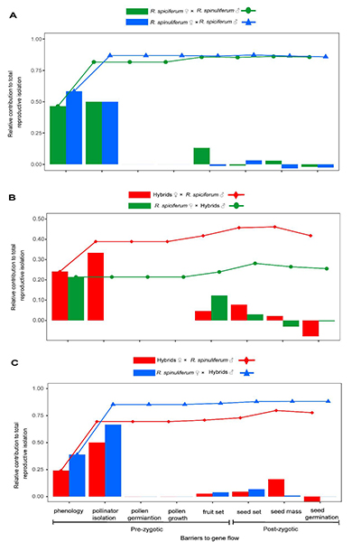 图2. 杂种群及两亲本间生活史各阶段生殖隔离的定量分析 |