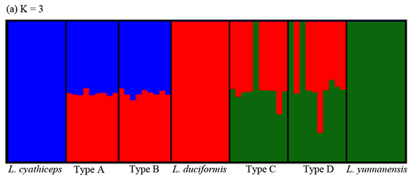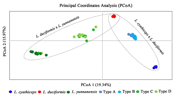 图2 基于2150个SNPs位点的68个个体的主坐标分析 以上研究结果发表情况如下: 1. Maintenance of species boundaries in three sympatric Ligularia (Senecioneae, Asteraceae) species. Journal of Integrative Plant Biology, 2018, 60 (10): 986–999; doi: 10.1111/jipb.12674 2. Molecular evidence for asymmetric hybridization in three closely related sympatric species. AoB PLANTS, 2018, 10: ply011; doi: 10.1093/aobpla/ply011 3. Molecular evidence for natural hybridization between Ligularia nelumbifolia and Cremanthodium stenoglossum (Asteraceae, Senecioneae). Botany, 2019, 97: 53–69; doi.org/10.1139/cjb-2018-0022 4. Evidence for continual hybridization rather than hybrid speciation between Ligularia duciformis and L. paradoxa (Asteraceae). Peer J, 2016, 5: e3884; doi: 10.7717/Peerj.3884 5. Bidirectional natural hybridization between sympatric Ligularia vellerea and L. subspicata. Plant Diversity, 2017, 39 (04): 214-220; doi: org/10.1016/j.pld.2017.07.001 6. Chemical constituents of hybrids of Ligularia cyathiceps and L. lamarum/L. subspicata collected in China: Structures of subspicatins M, N, O1, and O2, and related compounds. Phytochemistry, 2017, 140: 69-76; doi: 10.1016/j.phytochem.2017.04.015 7. Chemical Constituents in Hybrids of Ligularia tongolensis and L. cymbulifera: Chemical Introgression in L. tongolensis. Chemistry & Biodiversity, 2016, 13: 837-844; doi: 10.1002/cbdv.201500227 以上研究得到了国家自然科学基金面上项目(No. 31470336)和国家自然科学基金国际(地区)合作与交流项目(NSFC-JSPS,No. 31611140109)的资助。 (责任编辑:李雪)