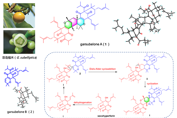 昆明植物所在异戊烯基杂合酰基间苯三酚(PPAP)类天然产物的研究中取得新进展 文章来源:植物化学与西部植物资源持续利用国家重点实验室 | 发布时间:2019-04-29 | 作者:许刚 | 浏览次数: | 【打印】 【关闭】 从特色天然产物类群和重要药用植物类群中发掘结构新颖、活性显著的化合物是植物化学研究的重要内容与使命。多环多异戊烯基取代酰基间苯三酚类天然产物(简称PPAP)是一类源自聚酮和异戊烯基复合途径、且特异性分布于广义藤黄科(Guttiferae)植物中的特色天然产物类群。其研究始于上世纪1975年,前苏联科学家从西方著名抗抑郁药用植物贯叶金丝桃(Hypericum perforatum)中鉴定了首个具有双环[3,3,1]壬烷-2,4,9-三酮核心骨架的PPAP类化合物贯叶金丝桃素(hyperforin)并引起了相关领域科学家的广泛兴趣。目前报道的天然PPAP已超过500个;除了其生源为特色的复合途径之外,其核心骨架多其他天然产物类群少见的立体、刚性结构,与常规的黄酮、香豆素等多酚类及萜类、生物碱类也截然不同;此外其在抗抑郁和抗肿瘤方面的药理活性值得深入挖掘和研究。 中国科学院昆明植物研究所重要类群植物化学及功能研究团队许刚研究组长期从事天然PPAP的研究工作,先后对近20种藤黄科植物中的PPAP类成分开展了深入的研究,发现了大量结构新颖、活性显著的化合物;相关成果在Org. Lett., Chem. Commun., Sci. China Chem.和J. Nat. Prod.等国际高水平杂志上发表原创性论文近30篇,2018年应邀在化学领域top1的权威杂志Chem. Rev.上发表论文,对这一领域的研究进展与发展态势进行了总结与展望,有力的推动了天然PPAP的研究进程。近期研究组在研究所“学科交叉引导性项目KIB2017001”和云南省重点基金(2015FA032)等项目的资助下,选择对藤黄科不同属(genus)、组(section)的代表性物种开展了PPAP针对性研究,并取得了一系列突破性的原创研究成果。 其中博士研究生汪永玲在藤黄属代表性物种菲岛福木(Garcinia subelliptica)的研究中,通过HPLC-MS发现了MS>900的分子离子峰的存在,并经由一系列分离纯化手段成功纯化得到化合物garsubelone A。然而,该化合物谱图信号的重叠、缺失等因素对其结构确证带来了巨大的挑战,最终研究组凭借多年积累的经验,确定garsubelone A为具有6/6/6/6/6/6/6七环复杂骨架的PPAP二聚体,并由X射线单晶衍射确定了其绝对构型。生源上该化合物应该是由garsubelone B的C-3位的异戊烯基末端脱氢形成共轭双烯后,与secohyperforin通过Diels-Alder环加成反应以及进一步环化形成。上述研究成果以“Garsubelone A, the First Dimeric Polycyclic Polyprenylated Acylphloroglucinols with Complicated Heptacyclic Architecture from Garcinia subelliptica”为题发表在Organic Letters (DOI: 10.1021/acs.orglett.9b00388)。系首个天然PPAP二聚体的研究报道。