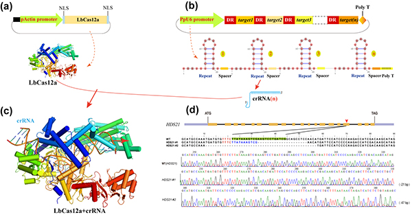 图1. CRISPR/LbCas12a介导的基因编辑模式图:(a) LbCas12a表达载体;(b)多重crRNA表达盒的载体图;(c) LbCas12a和crRNA复合物的示意图;(d)靶基因切割的示意图 (责任编辑:李雪)