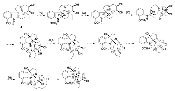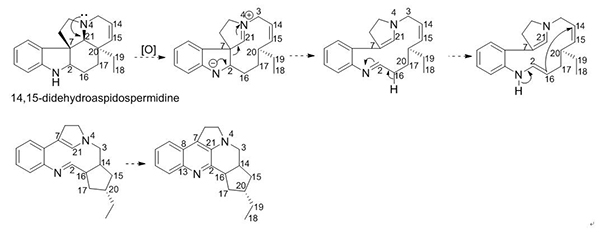 图2 Taberbovines A-D骨架可能的生源途径 一般认为单萜吲哚生物碱唯一前体是1分子色氨(tryptamine)和1分子裂环马钱子苷(secologanin)缩合产生的异胡豆苷(strictosidine)。研究团队曾在2011年从盆架树中发现由色氨与裂环马钱子苷以1:2的比例缩合形成的alstrostine A(Org. Lett. 2011, 13, 3568)。而在最近的研究中,博士研究生郁阳从药用狗牙花叶中发现生物碱tabernabovine A,该分子是色氨酸与裂环马钱子苷以2:1的比例缩合而来的(图3)。上述研究结果共支撑单萜吲哚生物碱生源的多样性。同时还发现新颖骨架的生物碱tabernabovine B 和C。Tabernabovine B是由多个桥环形成的笼状型化合物;Tabernabovine C是骨架重排的氧化吲哚生物碱。上述生物碱结构也得到了核磁谱图、X-单晶衍射、计算圆二色谱和核磁共振谱等支持,同时对tabernabovine B-C 的生源过程进行推测(图4)。以上研究成果以“Tabernabovines A–C: three monoterpenoid indole alkaloids from the leaves of Tabernaemontana bovina”为题也发表在Organic Letters(2019, 21, 5938-5942)上。