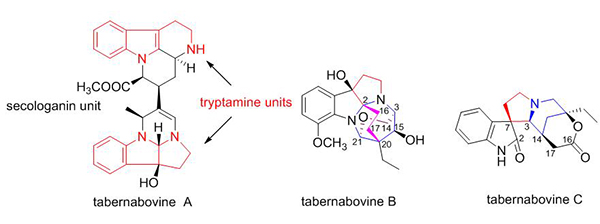 昆明植物研究所在单萜吲哚生物碱研究上取得新进展 文章来源:植物化学与西部植物资源持续利用国家重点实验室 | 发布时间:2019-08-20 | 作者:吴静,郁阳,石宝宝 | 浏览次数: | 【打印】 【关闭】 单萜吲哚生物碱具有结构复杂、成药率高的特点,一直是天然药物化学研究的热点。迄今已报道该类生物碱约3000个,其中应用于临床药物有数十个,如长春碱类、喜树碱类、奎宁碱类、士的宁碱类、玫瑰树碱类等。我国西南是单萜吲哚生物碱植物资源最丰富的地区,是生物碱研究的宝贵资源。中国科学院昆明植物研究所植物化学与西部植物资源持续利用国家重点实验室云南特色植物资源的利用与开发团队蔡祥海研究组一直致力于单萜吲哚生物碱的研究,近期研究取得新的进展。