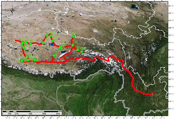图四 考察路线图 为探究冰缘带植物多样性,考察队大多在4600m以上的高海拔工作(图五),且由于是非旅游路线,食宿条件较差,常有停电情况发生,给室内工作带来诸多不便(图六)。考察队学习老一辈科考队员不畏艰苦的精神,克服了高原缺氧、生活不便等困难,收集了高山冰缘带45个4m×4m的样方资料,并对冰缘带不同植物群落类型进行调查。最终获得三至五份标本为一号的标本和分子材料共1099号,其中包括样方标本581号,样方周围的典型冰缘带植物标本483号,6个不同冰缘带群落标本35号;高山典型植物11个种的居群分子材料;拍摄藏北植物影像资料约30G,包含一万余张照片和数十个视频。