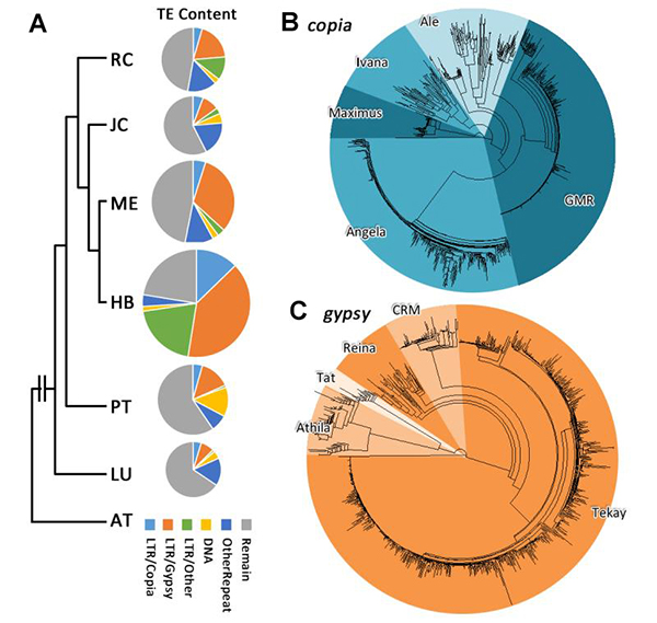 图 3 大戟科植物基因组的染色体进化 图 4 橡胶树基因组大小与反转录转座子家族的进化