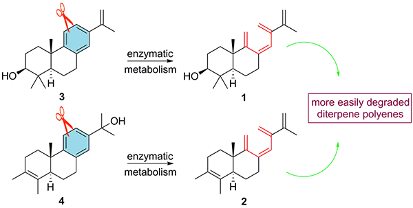 昆明植物所发现一种新的昆虫对植物芳香松香烷二萜的解毒机制 文章来源:植物化学与西部植物资源持续利用国家重点实验室 | 发布时间:2019-12-16 | 作者:郭凯 | 浏览次数: | 【打印】 【关闭】 松香烷二萜是一类普遍存在于植物体中的天然产物,具有广泛的生物活性,包括许多重要的药理活性,以及显著的生态学功能。芳香松香烷二萜(Aromatic abietanoids)是松香烷二萜中最大的亚类,结构中含有特征的芳香性C环,稳定性较高,难于被其他生物代谢和降解,对植食性昆虫具有较强防御功能。 中国科学院昆明植物研究所活性天然产物发现与生物合成团队黎胜红研究组多年来致力于喜马拉雅特有唇形科植物米团花(Leucosceptrum canum)的次生代谢产物及其生物功能研究,前期解析了引起米团花有色花蜜的新颖色素物质——脯氨酸-对苯二醌共轭体及其吸引传粉鸟类的功能(Org. Lett. 2012, 14: 4146-4149),并从该植物中发现了系列骨架新颖、结构多变并具有重要防御功能的米团花烷二倍半萜类化合物(Angew. Chem. Int. Ed. 2010, 49: 4471-4475;Org. Lett. 2011, 13: 1864-1867; Org. Lett. 2012, 14: 5768-5771; Org. Lett. 2014, 16: 6416-6419),在此基础上鉴定了植物二倍半萜生物合成途径的关键酶GFDPS,并首次揭示二倍半萜是在质体中通过MEP途径生物合成(Plant Cell, 2016, 28: 804-822; Cover article)。此外,研究组近期研究发现,米团花中还含有丰富的细胞毒活性芳香松香烷二萜(Phytochemistry, 2019, 157: 43-52)。大量防御功能和毒性萜类化合物的存在使得米团花很少被植食性昆虫取食。然而,研究组经过多年观察发现,绿孔雀夜蛾(Nacna malachitis)幼虫能够适应米团花植物并特异性地取食该植物叶片。通过实验室培养该昆虫,仅饲喂米团花叶片,对其排泄物进行收集分析以及系统的化学成分研究,结果从中发现两个具有11,12-断裂松香烷新颖骨架的二萜多烯化合物:Nacnabietanins A(1)和B(2)。二者极不稳定,结构测定后在冰箱贮存过程中很快自发降解。这种11,12-断裂导致芳香C环开环的松香烷二萜非常罕见,此前在自然界中并未发现,也从未以化学合成中间体的形式被报道,推测它们分别由米团花叶中大量存在的化合物3和4在昆虫体内经过特殊的酶催化生成。这种将芳环裂解为末端双键的酶促代谢过程可能为绿孔雀夜蛾幼虫对毒性芳香松香烷二萜的一种特殊解毒机制。研究结果揭示了一种新颖的昆虫对植物芳香松香烷二萜的解毒机制,也可能被昆虫用来降解其它芳香性植物毒素,以及对含有苯环结构的杀虫剂产生抗性。 目前,该研究结果以“Detoxification of Plant Aromatic Abietanoids via Cleavage of the Benzene Ring into 11,12-Seco-diterpene Polyenes by a Specialist Insect of Leucosceptrum canum”为题发表在Organic Letters上。研究组郭凯博士为该篇文章的第一作者,黎胜红研究员为通讯作者。该研究得到了国家杰出青年基金项目、国家自然科学基金重点和面上项目等资助。