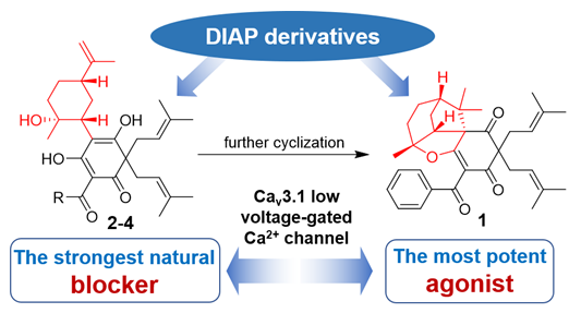 昆明植物所从天然PPAP中发现活性最强的Cav3.1钙通道天然抑制剂与激活剂 文章来源:植物化学与西部植物资源持续利用国家重点实验室 | 发布时间:2020-02-14 | 作者:许刚 | 浏览次数: | 【打印】 【关闭】 近年来天然药物化学的研究越来越注重活性显著的新颖、特色天然产物类群的创新性研究。天然PPAP是一类异戊烯基杂合去芳化间苯三酚母核的特殊天然产物类群。由于其新颖、复杂、多变、独特的化学结构以及在神经系统与肿瘤等方面的潜力,吸引了去全球科学家的广泛关注。然而由于天然PPAP的“分离-纯化-鉴定”存在巨大挑战,加之其功能研究一直未能够取得突破性的进展,导致近年来这一领域的研究主要集中于天然产物化学与全合成化学研究,在药学方面的进展一直未能够取得重大的突破。中科院昆明植物所许刚研究团队十多年来一直着力于天然PPAP的系统研究,并取得了一系列原创新研究成果,目前已在Org. Lett., Chem. Commun.等期刊上发表SCI论文30多篇,并于2018年受邀在国际顶尖杂志“Chem. Rev.”发表综述,对这一领域的发展进行了总结与展望。 近期,研究团队与中科院昆明动物所年寅博士合作发现首个3,3,5,5-四异戊烯基取代生源前体的PPAP类化合物hyphenone A对Cav3.1有显著抑制作用(Tetrahedron Lett. 2019, 60, 151220),并被国际权威杂志Nat. Prod. Rep.评为“Hot Off Press” (2019, 36, 161)。合作双方以此为契机,对新近发现的新颖结构PPAP开展了离子通道方面药理活性的深入挖掘,结果发现金丝梅(Hypericum patulum)中具有新颖spiro[bicyclo[3.2.1]octane-6,1'-cyclohexan]-2',4',6'-trione笼状骨架的hypatone A(1)对Cav3.1的激活作用EC50 = 3.80微摩尔,可被视为目前最强的Cav3.1激活剂。有趣的是,其可能的生源前体(2–4)表现出截然相反的抑制活性,其中化合物4是目前活性最强天然抑制剂(IC50 = 0.19微摩尔);电生理研究还揭示了化合物1和其生物学前体2作用于同一个靶点。值得指出的是,如上所述的生源直接相关却具有完全相反活性的案例,在天然产物中是十分罕见的,其构效关系与机制还值得进一步的研究。此外,研究还发现化合物1能够恢复诱发脊髓小脑性共济失调42型(目前无药可治的遗传性神经退行性疾病)的Cav3.1突变通道的门控特性,为相关药物研发提供了首个先导结构。下一步将以上述分子为探针分子,阐明它们与通道的结合位点及调控方式。这一工作不仅为天然PPAP的活性研究注入了新的活力,也将为Cav3.1这类特殊钙通道开放及关闭分子机理的认知夯实基础。
