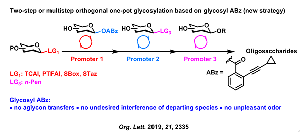 糖类化合物在许多生命过程中扮演了非常重要的角色,如,细菌和病毒的感染,细胞生长和增殖,免疫反应等等。与通过基因调控的生物合成蛋白质和脱氧核糖核酸(DNA)相比,糖类化合物的生物合成不是基因调控的,而是在内质网和高尔基体中通过逐步的和酶的后翻译修饰的过程,从而导致了糖类化合物的非均一性和极其多样的结构。从自然界中分离提取纯的和结构均一的多糖是一项非常艰巨的工作。化学合成是一种有效的和可规模化的方法来得到纯的和结构确定的糖类化合物,从而可以深入研究其功能和发展新的治疗药物。然而,与通过自动化固相合成仪方便制备核苷酸和多肽相比,糖类分子的化学合成要落后地多,困难地多。 中国科学院昆明植物研究所天然产物合成化学团队肖国志课题组主要从以下两方面开展糖化学合成研究工作:(1)发展糖化学合成的新方法和新策略;(2)对具有重要生物活性的糖类天然产物进行化学合成和生物活性研究。 2019年该课题组报道了基于糖基邻炔基苯甲酸酯(俞氏糖苷化反应)的正交一锅糖苷化反应策略(Org. Lett. 2019, 21, 2335)。此策略解决了之前基于硫苷的正交一锅法合成所存在的硫苷苷元转移,离去基团干扰和硫醇味道大的问题,大大扩宽了其的应用范围。此研究成果第一作者为博士研究生张云琴。