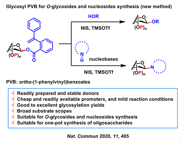 今年初,该课题组发展了一种新颖的糖苷化反应,可以实现对氧苷和核苷的高效合成(Nat. Commun. 2020, 11, 405)。此方法采用易于制备而且稳定的糖基邻1-苯基烯基苯甲酸酯(PVB)为新颖的糖基给体,N-碘代丁二酰亚胺(NIS)和三氟甲磺酸三甲基硅酯(TMSOTf)为便宜易得的促进剂,同时,具有反应条件温和,宽广的底物范围,和良好到优秀的糖苷化反应收率。值得一提的是,PVB给体可以与三氯乙酰亚胺酯(TCAI)给体(Schmidt糖苷化反应),糖基邻炔基苯甲酸酯(ABz)给体(俞氏糖苷化反应)结合进行正交一锅糖苷化反应,实现各种具有重要生理活性的寡糖的高效合成。同时,PVB给体也可以成功应用于核苷类抗生素药物卡培他滨,加洛他滨和去氧氟尿苷高效合成中。此研究成果第一作者为博士研究生李朋华,何海清博士和博士研究生张云琴。