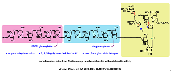近日,肖国志课题组报道了采用之前发展的正交一锅糖苷化反应策略实现了具有强抗糖尿病番石榴多糖的19糖重复单元和子结构的高效合成,从而可以深入研究其生物活性,为将来开发治疗糖尿病药物打下坚实基础。此研究成果在线发表于Angew. Chem. Int. Ed. (DOI: 10.1002/anie.202000992)。此研究成果第一作者为博士研究生张云琴,陈子汐和黄盈盈。