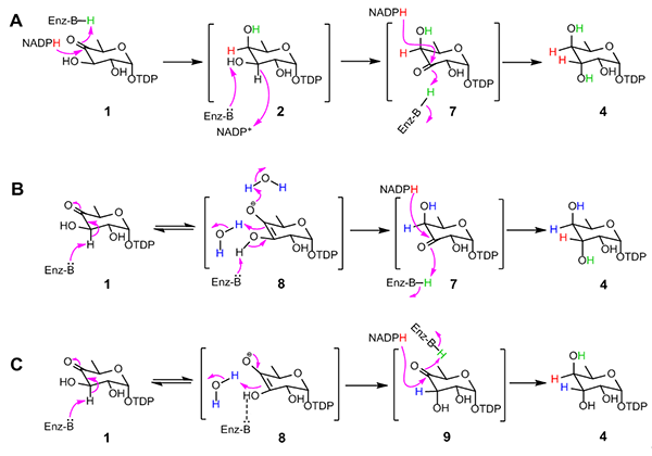 图1. 酶RubS3将底物1转化为产物4的三种可能机制