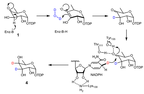 天然糖类是活性天然产物的一个重要结构单元,糖苷化修饰有利于提高活性分子的生物相容性及靶点识别的特异性,迄今许多临床一线使用的药物如红霉素、阿霉素及万古霉素等都是糖苷类化合物。弩箭子糖(antiarose)是一类六碳脱氧糖,最初于1896年由水解剧毒木本植物见血封喉树汁液中的天然毒素—— α-弩箭子甙(α-antiarin)得到。据报道,目前大约有50多种强心苷类化合物中含有弩箭子糖结构,这一类强心苷类化合物对Na+/K+-腺苷三磷酸酶或者是人肿瘤细胞系具有纳摩尔级的抑制活性,它们在心力衰竭、房性心律失常和癌症的治疗方面具有重要的临床应用价值。除上述强心苷外,弩箭子糖这一不常见的天然结构仅存在于少数几个天然产物中,且目前弩箭子糖的生物合成机制尚不清楚。 2016年初,中国科学院昆明植物研究所天然药物化学前沿交叉团队黄胜雄研究组阐明了托酚酮吡啶生物碱类化合物rubrolones生物合成过程涉及二型聚酮合酶和氧化酶介导的复杂氧化重排形成托酚酮环的化学机制(Org. Lett. 2016, 18, 1254)。随后通过该研究组对rubrolones的生物合成途径作了进一步地详细解析,阐明了自然界普遍存在非酶催化的吡啶环生物合成机制 (Nat. Commun. 2016, 7, 13083)。 最近,该课题组在前期生物合成解析基础上,对其糖配体的关键基因进行了深入研究。通过系列的体外酶学实验证实了rubrolones中糖配体关键基因RubS3-S5的作用逻辑,并运用波谱学方法确定了酶RubS3作用后的产物为TDP-D-antiarose (4)。分析酶RubS3体外反应的底物TDP-4-keto-6-deoxy-D-glucose (1)和产物TDP-D-antiarose (4)的结构差异,对酶RubS3可能的催化机制提出了三种假设 (图1, 机制 A、B和C)。随后,通过设计系列氘原子标记的体外酶学实验探索了酶RubS3的作用机理,初步发现它通过推测的机理C产生作用,即NADPH中4S-H传递到C-4位羰基,完成羰基的还原,溶剂中的质子传递到C-3位,经烯醇中间体完成C-3位的异构,从而形成产物TDP-D-antiarose (4)。酶RubS3由此被鉴定为一类新型的还原-异构双功能酶,系统发育分析发现rubterolone生物合成基因簇中的酶RblE与之有较高的相似性。后续的体外酶学实验证实酶RblE也能将底物TDP-4-keto-6-deoxy-D-glucose转化为产物TDP-D-antiarose,且与酶RubS3具有相似的米氏动力学参数。序列比对发现酶RubS3具有短链脱氢/还原酶中的活性催化三联体Thr111-Tyr135-Lys139。据此,使用点突变的方法构建了酶RubS3的三种突变蛋白(T111V, Y135F和 K139A),体外酶学实验发现上述突变蛋白的催化活性较野生型蛋白显著降低或完全消失,但有关酶RubS3碱性残基的突变的一系列蛋白突变体却没有表现出催化能力的改变,暗示酶RubS3作用时C-3位羟基的异构可能经由一种潜在的新机制完成。 上述研究内容表明,RubS3和RblE是一类新型的还原-异构双功能酶,它们均通过图2所示的机制催化自然界中稀有弩箭子糖的生物合成。这一类酶的发现解决了百年来悬而未决的有关自然界中弩箭子糖如何形成的科学问题,为后期利用相关组合生物合成和合成生物学手段扩充天然糖苷化合物的结构多样性奠定了基础。 该研究成果以“Biosynthetic access to the rare antiarose sugar via an unusual reductase-epimerase”为题在线发表于国际期刊Chemical Science。上述研究工作得到了国家自然科学基金-云南省联合基金重点项目(U1702285)、国家合成生物学重点研发计划、中科院青年创新促进会专项、云南省人才专项和应用基础研究计划等项目资助。