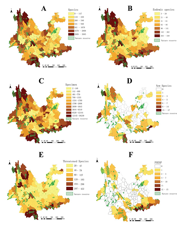 图1:云南省物种多样性的县级分布热图。A 所有种,B:特有种,C:标本数,D:新种,E:受威胁物种,F:极小种群。