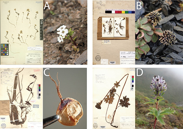 图2:近期野外考察中“重新发现”的一些迄今为止仅有早期模式标本的物种的模式标本照和彩图A 中甸半脊荠(Hemilophia serpens)发表于1915年,B:黑果毛茛 (Ranunculus melanogynus)发表于1960年,C:多雄薹草(Carex polymascula)发表于1983年,D:尖距翠雀花(Delphinium oxycentrum)发表于1937年。 (责任编辑:李雪)