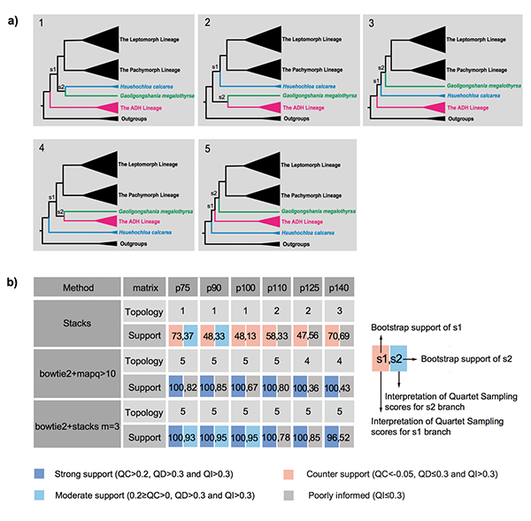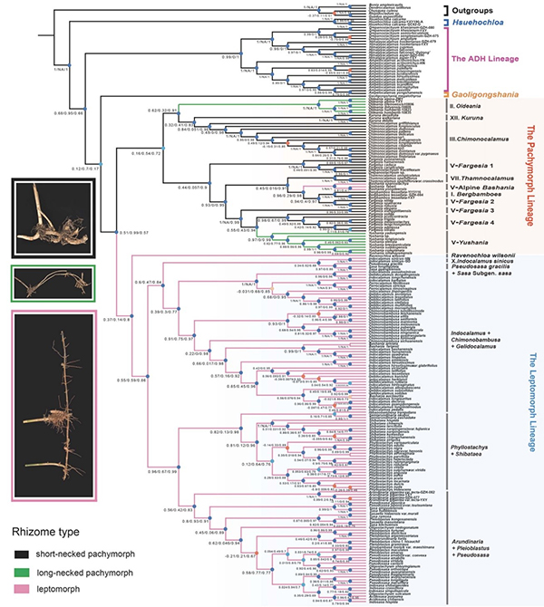 作为竹亚科三个族之一的青篱竹族(Arundinarieae),即温带竹类,是一个自然的单系分支。该分支包含35属约580种,包括了具有重要经济价值的毛竹,观赏价值极佳的紫竹、湘妃竹、方竹、筇竹和箬竹等,还包括大熊猫在自然生境中的全部主食竹种,其中的不少高山物种还是中国西南山地亚高山植物群落的优势种。温带竹类广泛分布于亚洲、北美和非洲的热带、亚热带高山和温带低海拔地区,其中属东亚物种数目最为丰富,为其现代多样化中心。该类群开花周期长达几年甚至120年,难以获得具花标本,加上营养体形态特征高度复杂和多样化,从而导致温带竹类物种界定困难,属间关系争议很大。 前期研究表明,温带竹类具有复杂的异源多倍化起源(Guo et al., 2019, Mol. Plant)和可能的近期辐射演化历史(Zhang et al., 2016, Mol. Phylogenet. Evol),因此是了解植物异源多倍化和辐射演化历史的重要代表性类群。基于叶绿体全基因组数据的研究将温带竹类划分为12个主要的支系(Ma et al., 2014, Syst. Biol.; Ma et al., 2017, BMC Plant Biol.),但在亚族和属的水平上都与经典分类存在明显的冲突。与相对保守的叶绿体序列相比,核基因序列具有双亲的遗传信息,变异速率快等特点,因此在解决辐射演化的系统发育关系问题方面更具潜力。不过,由于温带木本竹类是异源四倍体,要明确鉴定出单拷贝或低拷贝核基因及其直系同源序列较为困难,目前基于温带竹类的核基因数据还非常有限,基于核序列的温带竹类系统发育框架尚未确立。 近年来,简化基因组测序(RAD-seq)和浅层测序(genome skimming)技术的迅速发展,为解析复杂类群的演化关系提供了契机。中国科学院昆明植物研究所李德铢和郭振华研究团队多年致力于竹类植物分类、系统发育和演化研究。近期,该团队结合双酶切位点相关的简化基因组测序(ddRAD-seq)和浅层测序技术,共选取了32属200种213个个体构建了温带竹类的系统发育框架。在此基础上,对内部各个主要支系的分化时间进行估算,并结合多样化分析、关键性状演化分析等结果,揭示了青篱竹族复杂的演化历史。 考虑到温带竹类复杂的演化背景,该研究首先通过计算机模拟的方法评估了使用ddRAD-seq数据探讨多倍化和快速辐射类群系统发育的可行性,优化了数据组装的聚类阈值和直系同源序列鉴定的分析流程。通过比较无参考基因组的(de novo)与基于参考基因组的(reference-based)组装方法,共得到五种不同的拓扑结构(图1),均支持将温带竹类划分为5个主要的支系。通过一致性检验结果、SNP位点数目和缺失数据量等因素进行综合考虑,最终确定得到一棵稳定的系统发育树(图2),并认为有参考基因组的方法更加适合于这一辐射演化古多倍化类群的系统发育重建。在该系统树中,属间关系得到较好解决,与叶绿体基因组数据建立的系统树相比,更多属的单系得到支持,与经典分类的划分较为一致。纪如竹分支(Hsuehochloa)最早分化,由悬竹属(Ampelocalamus)、镰序竹属(Drepanostachyum)和须弥筱竹属(Himalayacalamus)构成的ADH分支(the ADH lineage)其次,随后分化的是贡山竹分支(Gaoligongshania),剩余的类群可以按照地下茎类型划分为假鞭分支(the pachymorph lineage)和真鞭分支(the leptomorph lineage)。进一步比较发现,基于147个物种的叶绿体全基因组数据构建的系统树和ddRAD树具有强烈的冲突,检测出了65对冲突的系统关系。推测温带竹类的叶绿体基因和核基因有着不同的进化历史和复杂的网状进化关系,并推测不完全谱系分选和杂交事件是导致该类群网状进化的主要原因。 此外,分子钟时间估算和多样化分析结果显示(图3),温带竹类的干群发生于晚始新世至早渐新世,冠群于早中新世(18.73或20.96百万年前)开始分化,内部各主要支系在3.45个百万年内快速分化完成。结果支持在中新世中期温带竹类分别有一次谱系快速积累过程和分化速率的急剧上升事件(每百万年0.96种),推测青篱竹族的快速分化与中新世中期东亚季风的加强联系紧密。性状演化分析推断出地下茎类型的祖征为无假鞭的合轴型,具假鞭的合轴散生型地下茎和具真鞭的单轴型地下茎分别有两次独立的起源。真鞭类型的地下茎可能代表了一个关键创新性状的产生,其在11个百万年前出现,竹鞭的延伸能力大大加强,并在地下形成庞大的营养网络,极大促进了竹子扩散和定植至不同生境的能力。 该研究对于揭示温带竹类的辐射与网状演化具有重要的科学意义,为青篱竹族的亚族新分类系统的提出提供了强有力的支撑,对进一步研究该类群物种多样性的形成和网状演化机制打下了坚实的基础,也为利用系统发育基因组学解决其它古多倍化起源的辐射演化植物类群的系统发育关系提供了一个典型案例。研究成果近期以“Parallel ddRAD and genome skimming analyses reveal a radiative and reticulate evolutionary history of the temperate bamboos”为题在国际演化生物学顶级期刊Systematic Biology在线发表。此项成果是该研究组与美国哥伦比亚大学Deren Eaton博士合作完成,郭岑博士为论文第一作者,李德铢研究员和郭振华研究员为共同通讯作者。该研究得到了中国科学院战略性先导科技专项(B类)(No. XDB31000000)、国家自然科学基金项目(No. 31430011、31470322和31670227)、中国科学院重大科技基础设施开放研究项目(2017-LSFGBOWS-02)和中国科学院大学博士研究生国际合作培养计划(2017)的支持。