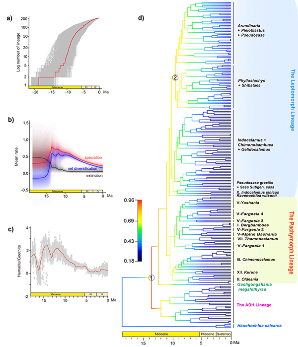 图3 温带竹类分化速率图:(a)LTT(lineage through time plots)图;(b)温带竹类的平均物种形成速率(红色)、净物种分化速率(蓝色)和物种灭绝速率(黑色)随时间的动态变化图;(c)东亚季风自中新世中期以来的强度随时间动态变化图;(d)青篱竹族各分支物种平均分化速率图,分支颜色表示平均物种形成速率,节点上的圆圈表示发生shift事件的节点 (责任编辑:李雪)