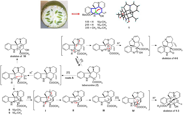 单萜吲哚生物碱(Monoterpene Indole Alkaloids,MIAs)具有结构多样、生物活性丰富、成药率高等特点,一直是天然药物化学研究的热点。迄今已报道MIAs约3000个,其中应用于临床药物有数十个,如长春碱类、喜树碱类、奎宁碱类、士的宁碱类、玫瑰树碱类等。中国科学院昆明植物研究所植物化学与西部植物资源持续利用国家重点实验室云南特色植物资源的利用与开发团队蔡祥海研究组一直致力于云南特色植物资源中MIAs结构的挖掘和新生物功能的探索。近年来,研究组陆续发现多个新颖骨架的MIAs(Organic Letters, 2019, 21, 4554;Organic Letters, 2019, 21, 5938)和具有抗肿瘤活性的二聚MIAs(Journal of Natural Products, 2017, 80, 790;Phytochemistry, 2018, 152, 125),此外还发现了具有潜在抑制黄嘌呤氧化酶活性MIAs(Phytochemistry, 2019, 166, 50)。而近期蔡祥海课题组在MIAs结构骨架的挖掘以及非细胞毒类的MIAs在神经系统生物功能方面的探索上又取得了新进展。 课题组成员博士研究生吴静在山橙属云南山橙(Melodinus yunnanensis)果实的研究中发现了一类单萜喹啉型新骨架生物碱Meloyunnanines A、B和C(图1,Hot off the Press. Natural Product Reports, 2020, 22),与云南山橙果实中的主成分scandine相比,新骨架分子在C2与C19之间形成新的碳碳键,构成笼状的六环体系,其绝对构型通过核磁共振、X-单晶衍射和圆二色光谱等方法予以确定。生源上可由tabersonine经两条不同路径的氧化重排而分别形成此类新化合物和scandine型生物碱。此外,通过体外小鼠原代培养皮层神经元的神经营养活性筛选试验,发现化合物scandine N4-oxide在10 μM浓度下有较好地促进神经突出生长,表明其具有潜在的神经保护活性。上述研究成果以“Cage-Monoterpenoid Quinoline Alkaloids with Neurite Growth Promoting Effects from the Fruits of Melodinus yunnanensis”为题发表在Organic Letters (2020, 22, 7676, DOI: 10.1021/acs.orglett.0c02871).