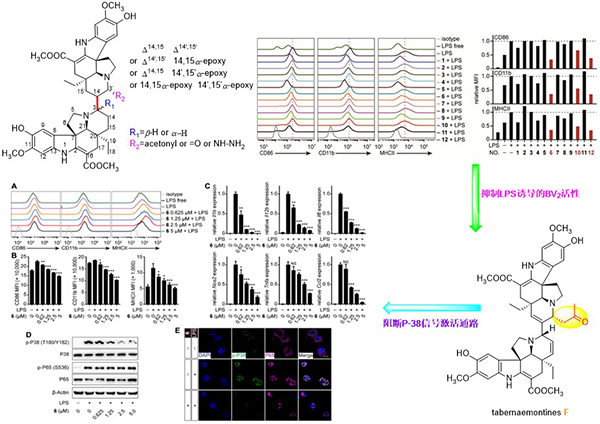 图1. Meloyunnanines A-C的结构以及可能的生源途径 小胶质细胞为中枢神经系统的免疫细胞,能持续调节中枢神经系统的稳态。正常状态下,小胶质细胞具有参与信号传递,突触修复以及免疫监督的作用。当它受到刺激后(中枢神经发生慢性炎症时),该细胞被大量激活。小胶质细胞一方面释放炎症介质和一些过氧化物的神经毒性物质,导致神经坏死;另一方面,通过免疫吞噬清除神经细胞残骸,利于其再生,同时分泌各自细胞因子促进损伤的神经元修复。因此,小胶质细胞活化对中枢神经起到损伤和修复的双重作用,这与阿尔兹海默症(AD)、脑梗死以及神经痛等慢性疾病密切相关。故有效地抑制过激活化的小胶质细胞在神经炎症反应中是一重要指标,亦是先导化合物发现的重要靶标。 近期课题组成员郁阳博士从药用狗牙花(Tabernaemontana bovina)叶中获得了12个同一类型的二聚MIAs分子(图2),该类分子是由白坚木碱及其衍生物通过C-3和C-14′单键连接而成。对这类分子生物功能的挖掘研究,课题组采取与上海科技大学赵思蒙博士进行合作研究。进行了体外LPS诱导的小胶质BV2细胞活化的抑制活性筛选实验,发现了该类分子中tabernaemontines G具有很好的抑制BV2细胞活化活性,进一步机制研究表明tabernaemontines G分子是阻断了P-38信号激活通路来达到抑制BV2细胞活化的目的。该结果发现了MIAs具有抑制神经性炎症方面的生物功能,也是天然药物化学界少有的表达该类活性的分子。相关研究成果以“An Aspidosperma-type Alkaloid Dimer from Tabernaemontana bovina As a candidate for the Inhibition of Microglial Activation”为题发表在Organic Chemistry Frontiers (2020, 7, 1365)期刊上。