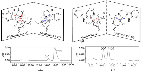 图2:白坚木碱二聚MIAs及其抑制LPS诱导的小胶质BV2细胞活化活性 自然界中对映异构体是普遍存在的,尤其是在萜类化合物中。但MIAs其生源前体色氨和裂环马钱子苷为固定的构型,继而为通过该生源途径来确定MIAs骨架构型提供了重要参考。前人研究也发现个别生物碱存在对映异构体的现象,如(±)–voaphylline , (±)–eburnamine, and (±)–cleavamine (±)–coronaridine和 (±)–vincadifformine。但上述MIAs对映异构体均在不同植物乃至不同属种发现,是否存在共存的MIAs是该类生物碱中重要的科学问题之一。郁阳博士从药用狗牙花茎中同时发现了两对对映异构体(图3),进一步的生源推测认为该类对映体可能是由secodine前体通过一系列氧化断裂形成了关键的亚胺盐中间体,再通过亲核反应,继而形成了具有多个手性中心和多元环骈合的骨架。这种多手性中心的复杂生物碱的对映异构体在自然界较为罕见。值得一提的是,非等比例对映异构体的发现实属不易(图3),这对后续探索“纯”MIAs分子具有重要意义。研究成果以“Discovery of Natural Co-occurring Enantiomers of Monoterpenoid Indole Alkaloids”为题发表在Chinese Journal of Chemistry(2020, 38, 10.1002/cjoc.202000574.)期刊上。