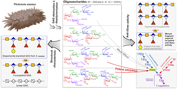 岩藻糖化糖胺聚糖(Fucosylated glycosaminoglycan, FG)是一类侧链含岩藻糖(α-L-fucose, Fuc)的糖胺聚糖(glycosaminoglycan, GAG)衍生物,因其化学结构特殊、药理活性显著而受到广泛关注。中国科学院昆明植物研究所天然产物药理学与新药创制团队赵金华研究组长期致力于此类化合物的药物化学和药理学研究,近来在与本所左之利、黄胜雄、秦洪波、云南大学张洪彬、中南民族大学刘吉开等课题组合作中取得新进展。 基于纯化寡糖策略,首次确证Thelenota ananas (梅花参)来源的FG含有杂二糖侧链,澄清了三十多年来关于FG中是否存在二糖侧链的学术疑问;Acaudina molpadioides(海地瓜)来源FG的确切结构解析进一步揭示FG二糖侧链的糖基组成及硫酸化形式呈现多样性特点;抗凝构-效关系及抗血栓活性分析显示,含二糖侧链的FG七糖即可具有强效抗凝抗血栓活性(Yin RH et al. Biomacromolecules 2021, 22: 1244;Mao H & Cai Y et al. Carbohyd Polym. 2020, 245: 116503)。基于侧链结构类型,探究了温和酸水解作用于FG侧链的一级动力学特征(Liu XX et al. Mar Drugs. 2020, 18: 286);基于纯品寡糖化合物的结构解析,首次揭示了岩藻聚糖过氧化解聚产物的特殊末端结构特征及其可能的化学机制(Li XM et al. Carbohyd Polym. 2021, 256: 117513)。 低分子量FG (LFG)新药相关研究中,报道了Holothuria fuscopunctata(象牙参)原料药材所含多糖的多样性特征,包括一种尚未见报道的氨基多糖(Gao N et al. Int J Biol Macromol. 2020, 164: 3421);从构-效关系及药学研究角度解析了~ 5.3kDa的LFG多组分药物作为内源性因子X酶(iXase)抑制剂的成药性特征(Zhou LT & Gao N et al. Thromb Haemost. 2020, 120: 607);系统分析了LFG所含寡糖同系物的化学结构、同系寡糖抑制iXase的活性强度及其靶点选择性、选择性抑制内源性凝血以及低出血倾向抗血栓活性特点,以数学模型清晰揭示了LFG抗凝抗血栓活性与化学组成之间的相关性(Sun HF & Gao N et al. Eur J Med Chem. 2020, 207: 112796)。 FG相关药理学活性研究还发现,FG及其衍生物对与血管新生和肿瘤侵袭相关的乙酰肝素酶(Heparanase, HPSE)具有显著抑制活性,且可显著抑制肿瘤相关的新血管生成以及肿瘤细胞转移(Zhou LT et al. Pharmacol Res. 2021, 166: 105527)。 所述论文的第一作者包括尹荣华、毛慧、蔡英、刘茜茜、李晓梅、高娜、周路坦、孙会芳;研究得到国家自然科学基金(81773737、81872774、81703374、31900926和81673330)、云南省科技计划重点项目(2016FA050)、云南省创新团队项目(2018HC012)、云南省科技计划重大专项(2019ZF011-2)等科研基金的资助。 图1. Thelenota ananas来源FG中含二糖侧链寡糖结构揭示天然复杂FG结构特征,揭示强效抗内源性iXase最简结构