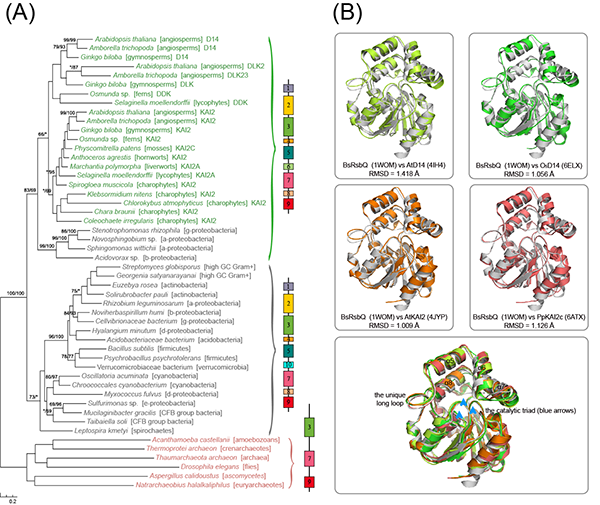 图1. 植物D14/KAI2与细菌RsbQ的系统发育分析及蛋白结构比对