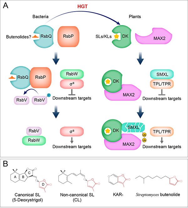 独脚金内酯与karrikin信号途径起源研究取得新进展 文章来源:中国科学院东亚植物多样性与生物地理学重点实验室 | 发布时间:2021-12-07 | 作者:王洽 | 浏览次数: | 【打印】 【关闭】 独脚金内酯(strigolactones, SLs)最初作为寄生植物种子萌发的刺激物被发现,近些年被确认为一类新型的植物激素。独脚金内酯不仅影响植物生长发育的许多方面(如调控分枝和根系形态等),还能作为植物与根际微生物之间的交流信号。Karrikins(KARs)是植物燃烧产生的小分子,包含一个类似于独脚金内酯D环的丁烯酸内酯部分。Karrikins最初也是作为种子萌发信号分子被发现,现在则被认为是一类未知的植物内源性分子(KLs)的类似物。该内源性分子通过karrikin信号途径发挥作用,影响众多植物发育及生理过程,如幼苗光形态建成、叶片发育和非生物胁迫反应等。 独脚金内酯与karrikins不仅在结构上有相似之处,其信号途径亦存在紧密关联。感知独脚金内酯和karrikins的受体D14和KAI2互为同源蛋白,同属α/β折叠水解酶超家族的一支,并通过与相同的F-box蛋白MAX2互作,促使抑制因子SMXL家族的不同成员发生泛素化降解,从而传导信号。KAI2在轮藻和陆生植物中广泛存在,而D14仅分布于种子植物当中,因此D14被认为是通过基因复制和新功能化从KAI2演化而来。但KAI2以及整个独脚金内酯/karrikin信号途径在植物中如何起源还尚不清楚。近日,中国科学院昆明植物研究所植物进化基因组学研究组与澳大利亚塔斯马尼亚大学开展合作研究,通过多方面的证据显示水平基因转移(Horizontal Gene Transfer, HGT)在独脚金内酯与karrikin信号途径起源和演化过程中发挥了关键作用。 研究人员通过广泛地搜索多种序列数据库,发现显著的D14/KAI2同源序列仅分布于轮藻、陆生植物和细菌当中。进一步的系统发育分析表明,植物D14/KAI2基因家族最可能是在轮藻与陆生植物的共同祖先阶段,通过水平基因转移从变形菌门细菌处获得的(图1A)。细菌中的同源蛋白RsbQ也属α/β折叠水解酶家族成员,能调控σB转录因子介导的胁迫反应。RsbQ具有酯酶的典型结构,且行使功能需要一个完整的催化三联体,表明它能够水解其配体。植物D14/KAI2与细菌RsbQ不仅在三维空间结构上整体相似,一些关键的特征结构和功能位点也高度保守(图1B)。这表明,从细菌RsbQ到植物D14/KAI2的水平基因转移过程中,一些重要的生化特性可能会在一定程度上被保留下来。D14/KAI2与RsbQ信号传导机制的比较分析,也显示二者间存在诸多相似之处(图2)。 细菌RsbQ基因的水平转移,可能直接赋予植物水解其内源或根际微生物丁烯酸内酯(或类似酯类分子)的代谢功能,以及通过蛋白构象变化识别配体这一重要机制。植物随后通过招募MAX2以及SMXL家族作为信号转导元件,形成了功能多样的丁烯酸内酯信号系统。系统发育分析还显示,植物中编码独脚金内酯合成关键酶D27、CCD7和CCD8的基因家族都是通过细胞内基因转移(Intracellular Gene Transfer, IGT)最初起源于蓝细菌共生体(即质体前身),随后经基因复制及新功能化被整合到独脚金内酯合成途径当中。这表明,独脚金内酯信号系统是由不同来源的基因(包括HGT、IGT和垂直传递)经功能演化后嵌合形成的(图3)。 D14/KAI2与RsbQ之间的进化关联及其保守性可能为相关领域的研究提供新思路。例如,独脚金内酯和karrikins的结构特征可以为细菌RsbQ配体的鉴定提供有价值的线索,而RsbQ则可能成为寻找植物KAI2内源配体的新工具。 相关研究成果以“Origins of strigolactone and karrikin signaling in plants”为题,近日在线发表于国际著名期刊Trends in Plant Science。昆明植物研究所王洽博士为论文第一作者,黄锦岭研究员与澳大利亚塔斯马尼亚大学Steven M. Smith教授为论文的通讯作者。研究得到国家自然科学基金、中国科学院西部之光人才培养计划、云南省基础研究计划、中国科学院战略先导科技专项、青藏高原二次科考,以及澳大利亚研究理事会卓越中心等基金项目的支持。