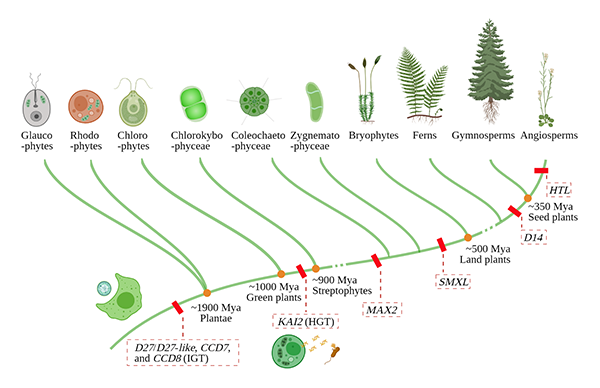 图3. 植物独脚金内酯与karrikin信号系统中相关基因起源的示意图 (责任编辑:李雪)