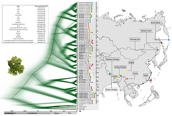 是地衣繁衍的乐园,还是孑遗物种的避难所?研究揭示绿藻类肺衣在喜马拉雅和横断山的演化过程 文章来源:中国科学院东亚植物多样性与生物地理学重点实验室 | 发布时间:2022-08-18 | 作者:杨美霞 | 浏览次数: | 【打印】 【关闭】 相比于大自然界各种瑰丽明艳的植物,地衣甚至有点丑怪;但早于侏罗纪前已有藻类和真菌的痕迹,实为生物中的 “老大哥”。地衣的形成是在合适的环境下,真菌孢子与藻类或蓝绿细菌自然选择——“姻缘天注定”。作为大型叶状地衣的代表之一——与绿藻共生的肺衣类,在喜马拉雅和横断山地区高海拔湿冷原始森林中尤为丰富多样,民间俗称“青蛙皮”或“老龙皮”,其食药用历史久远。然而,传统形态分类对绿藻类肺衣进行物种划分一直都十分困难,这类古老生物在喜马拉雅和横断山地区的物种组成与系统演化过程究竟是怎样的? 中国科学院昆明植物研究所王立松研究员与瑞士联邦研究所的杨美霞博士和Chritoph Scheidegger教授团队合作,对绿藻类肺衣基于核糖体RNA内转录间隔区(ITS)、编码RNA 聚合酶II第二大亚基(rpb2)和蛋白质翻译延长因子(tef1α)三个基因片段,构建了东亚绿藻类肺衣属系统发育框架,从分子系统发育、形态学和生态学证据综合研究:1)发现了11个新物种,且都发生于晚中新世纪之后,其中10个新物种均发现于中国喜马拉雅和横断山地区;2)澄清了东亚绿藻类肺衣共21种,其中喜马拉雅和横断山地区共15种,占东亚地区总数的2/3以上,是绿藻类肺衣在东亚的多样性分布中心;3)构建了绿藻类肺衣地衣的进化树,推算出此类地衣在东亚起源于中新世纪中期,喜马拉雅和横断山隆起所形成的复杂生态小环境,或许为绿藻类肺衣提供了多样生命形式繁衍的“乐园”,也可能同时为一些孑遗类地衣提供了 “避难所”。 研究结果以From cradle to grave? A global hotspot and new species of the genus Lobaria discovered in the Himalayas and the Hengduan Mountains为题,新近发表于真菌国际权威期刊Persoonia。该研究得到国家自然科学基金(31970022, 31670028)、第二次青藏高原综合科学考察研究(2019QZKK0503)、瑞士国家自然科学基金会项目、国家留学基金管理委员会等经费的支持。