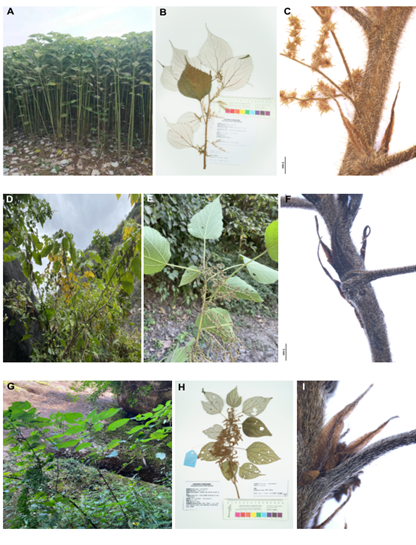 图1 苎麻的生境和形态。 A-C 栽培苎麻, D-F 野生苎麻, G-I 野化苎麻