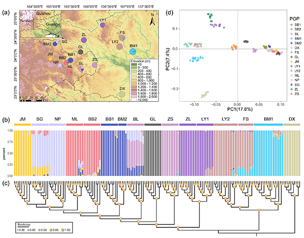 图1. (a)蒜头果采样分布点、(b-d)基于适应性位点的种群结构、PCA和进化树