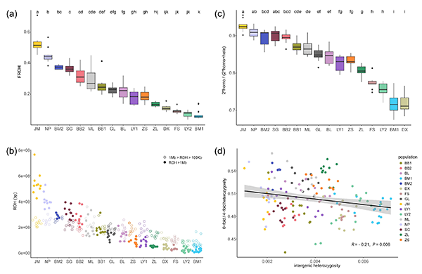 图2. (a)蒜头果不同种群FROH比较、(b)ROH长度在种群中的分布、(c)不同种群中纯和衍生有害突变的比例、(d)0-fold/4-fold杂合率和基因间区杂合率的关系