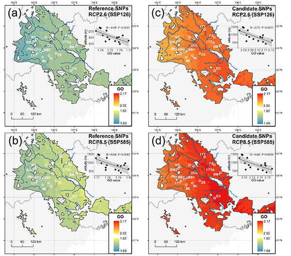 图3. 基于所有SNP(a、b)和环境适应性SNP(c、d)预测的未来情景下蒜头果的基因组脆弱性 |