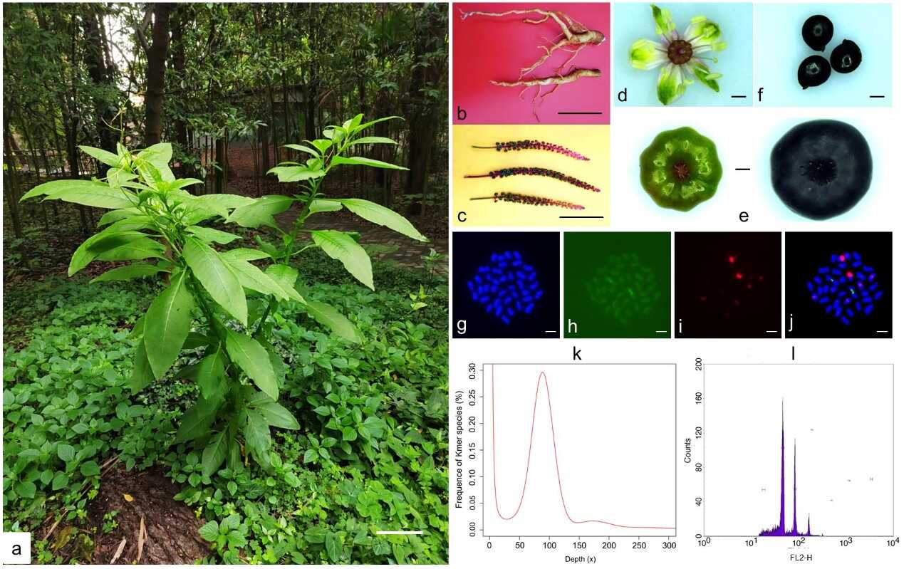 图1 二十蕊商陆的形态特征、染色体核型和基因组大小评估