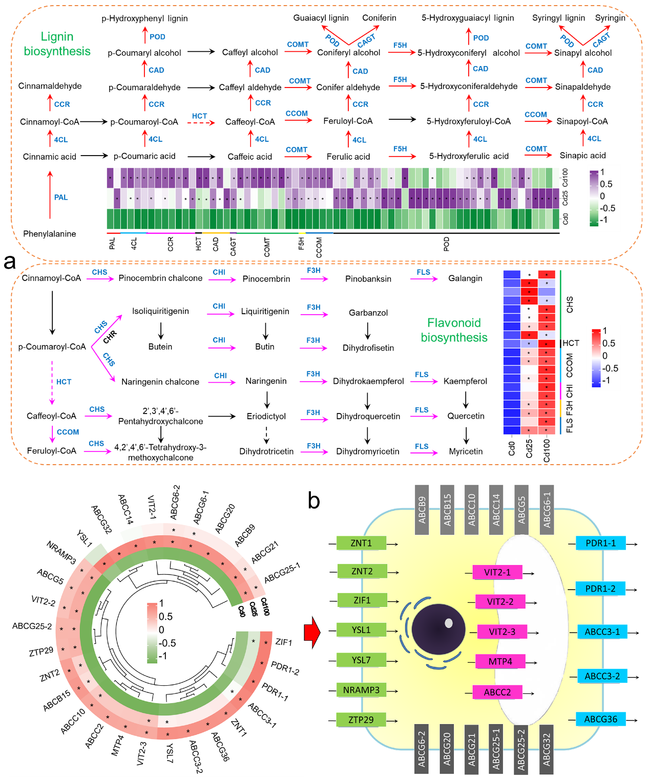 图3 二十蕊商陆根部受Cd胁迫诱导的木质素合成、类黄酮合成和Cd转运过程 |