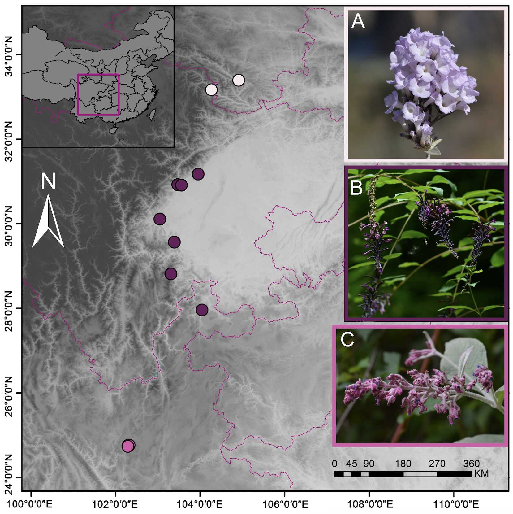 图1 三个目标物种的取样范围 A:甘肃醉鱼草;B:绛紫醉鱼草;C:安宁醉鱼草