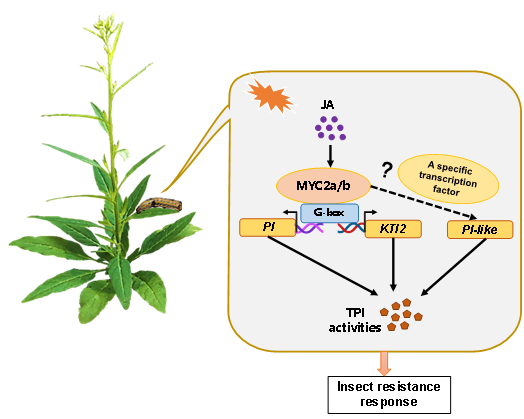 当植物受到害虫取食后,会快速激活防御基因的转录和表达,从而提高植物对昆虫的抗性。其中,胰蛋白酶蛋白酶抑制剂(TPI)是植物抵御昆虫的重要“化学武器”。它可以抑制昆虫肠道内的蛋白消化过程,从而延缓昆虫的生长发育。 前期研究发现,植物激素茉莉酸(JA)在植物抵御昆虫取食中发挥着核心作用,它可以极显著提高植物叶片中的胰蛋白酶蛋白酶抑制剂活性。但是JA调控胰蛋白酶蛋白酶抑制剂基因表达的分子机制仍然未知。 斜纹夜蛾(Spodoptera litura)是一种全球性分布的多食性和暴食性农业害虫,危害多种重要的经济作物。中国科学院昆明植物研究所次生代谢分子调控专题组以野生的二倍体烟草-渐狭叶烟草为模式,系统研究了斜纹夜蛾攻击时,植物通过JA增强胰蛋白酶蛋白酶抑制剂基因表达的分子机制。 研究发现了一种新的蛋白酶抑制剂,命名为NaPI-like。它能够赋予植物对斜纹夜蛾的抗性。NaPI-like基因的表达可被斜纹夜蛾口腔分泌物(OS)特异且高水平地诱导。过表达NaPI-like可显著提高叶片胰蛋白酶蛋白酶抑制剂活性,而沉默该基因则降低胰蛋白酶蛋白酶抑制剂活性。相应地,斜纹夜蛾在NaPI-like沉默的植株上生长得更好。 NaPI是马普化学生态所Ian Baldwin团队前期发现的一个PI-II 型蛋白酶抑制剂(Zavala et al.,2004),而NaKTI2是中国科学院昆明植物研究所次生代谢分子调控专题组发现的一个Kunitz型蛋白酶抑制剂(Yin et al.,2021)。研究发现,在野生型(WT)植株中,茉莉酸甲酯(MeJA)处理或伤口加斜纹夜蛾口腔分泌物处理(W+OS)均能显著诱导NaPI、NaPI-like及NaKTI2的表达。然而,在茉莉酸缺陷型irAOC植株中,经W+OS处理后,这三个基因的诱导表达程度均显著降低,说明它们均受茉莉酸信号通路调控。 同时沉默NaMYC2a与NaMYC2b可显著降低胰蛋白酶蛋白酶抑制剂活性,从而导致烟草的昆虫抗性下降。凝胶阻滞与Dual-LUC实验表明,NaMYC2a/b直接调控NaPI和NaKTI的表达,并间接调控NaPI-like的表达。 研究结果证实了NaMYC2a/b在昆虫取食后通过调控NaPI、NaPI-like及NaKTI2表达来增强胰蛋白酶蛋白酶抑制剂活性的过程中起着关键作用,这为理解昆虫取食过程中蛋白酶抑制剂的调控机制提供了新的见解。 相关研究成果以MYC2a/b‑regulated protease inhibitors in defense against Spodoptera litura in Nicotiana attenuata为题在线发表于Plant Cell Reports。中国科学院昆明植物研究所与云南大学联合培养博士研究生赵陆滟为论文第一作者,吴劲松研究员和王蕾研究员为论文共同通讯作者,云南大学生命科学学院刘军钟研究员参与此项研究。研究得到了云南基础研究重大项目(202401BC070015)和云南省创新团队(202505AS350018)的支持。