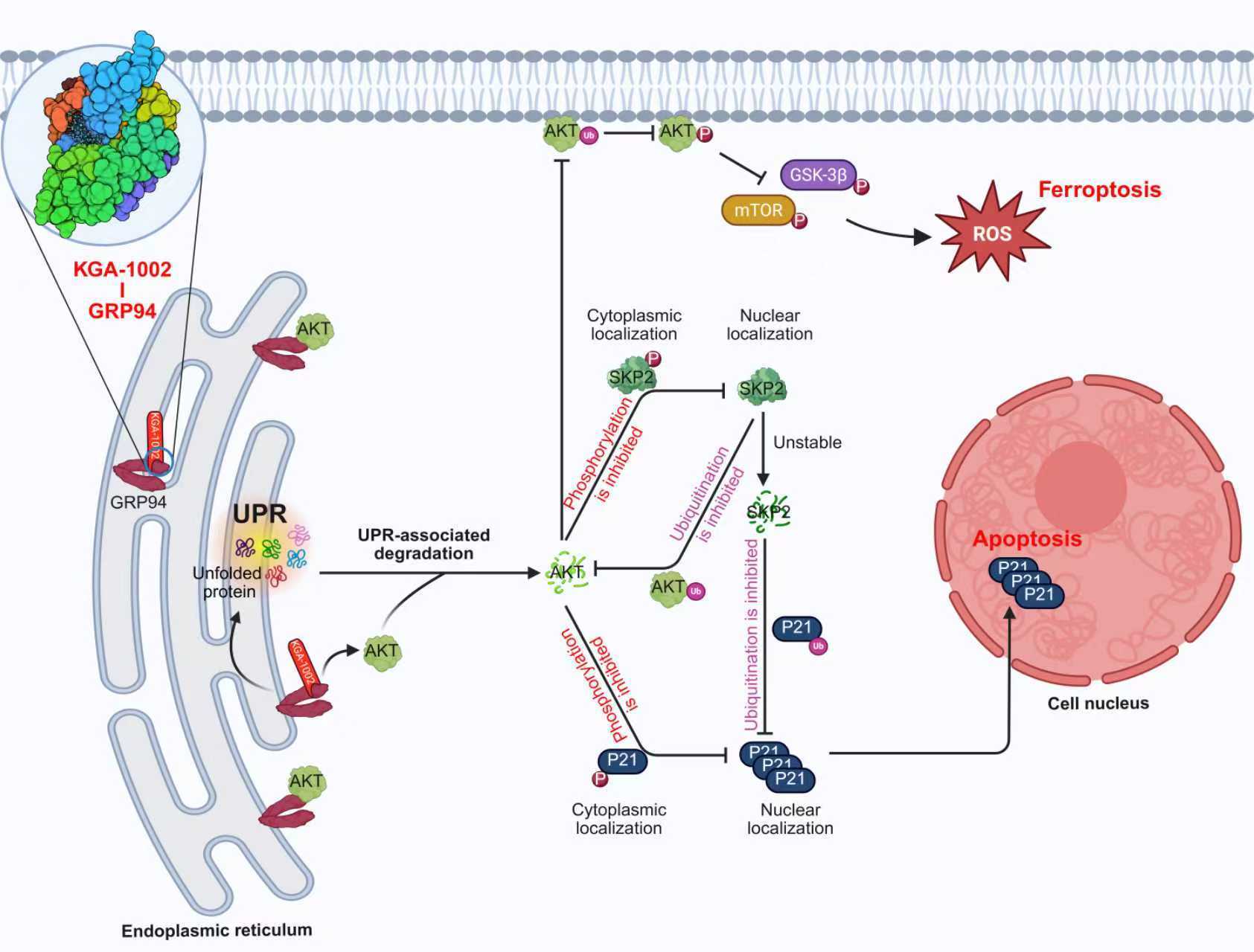 倍半萜二聚体是一类结构独特的天然产物,通常具有比其单体更强的生物活性。中国科学院昆明植物研究所陈纪军团队致力于蒿属植物中抗肝癌活性倍半萜二聚体的发现、合成与结构优化、作用机制与靶标及创新药物的研究。前期研究中,团队从蒿属植物中发现了一系列结构多样、具有显著体内外抗肝癌活性的倍半萜二聚体,可作用于肝癌发生发展的多个环节与靶点。为解决倍半萜二聚体在植物中含量低、来源受限的瓶颈,团队以仿生Diels-Alder反应为核心策略,构建了倍半萜二聚体的合成方法,完成了lavandiolides H、I 和K等天然产物及系列类天然倍半萜杂二聚体的合成。其中,愈创木烷倍半萜二聚体KGA-1002表现出显著的体外抗肝癌活性(ZL202210376598.9)。 为了揭示KGA-1002的抗肝癌作用靶点及其机制,研究通过DARTS实验和蛋白质谱分析,并结合生物信息学、SPR、Knock down等实验验证,发现其作用靶标为葡萄糖调节蛋白94(Glucose-Regulated Protein 94,GRP94),通过质谱分析和氨基酸突变揭示了Ser106是其共价结合位点。KGA-1002靶向GRP94触发了未折叠蛋白反应(UPR)相关的降解通路,破坏了GRP94与AKT的相互作用,导致AKT降解。AKT的降解诱导了铁死亡并使得其下游底物S期激酶相关蛋白2(S-phase Kinase-associated Protein 2,SKP2)的稳定性降低。AKT和SKP2的受损促进了P21的核内积累,从而进一步诱导HCC细胞凋亡。在动物模型中,KGA-1002(60 mg/kg)显示出显著的体内抗肝癌效果,对肿瘤生长抑制率达到61.6%,且此效应依赖于GRP94。该研究为开发新型抗肝癌药物研究提供了新的候选药物分子。